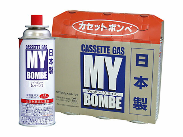 ▲使用ガスボンベ。マイ・ボンベL 250g 3本入最安値345円(10g@4.6円)